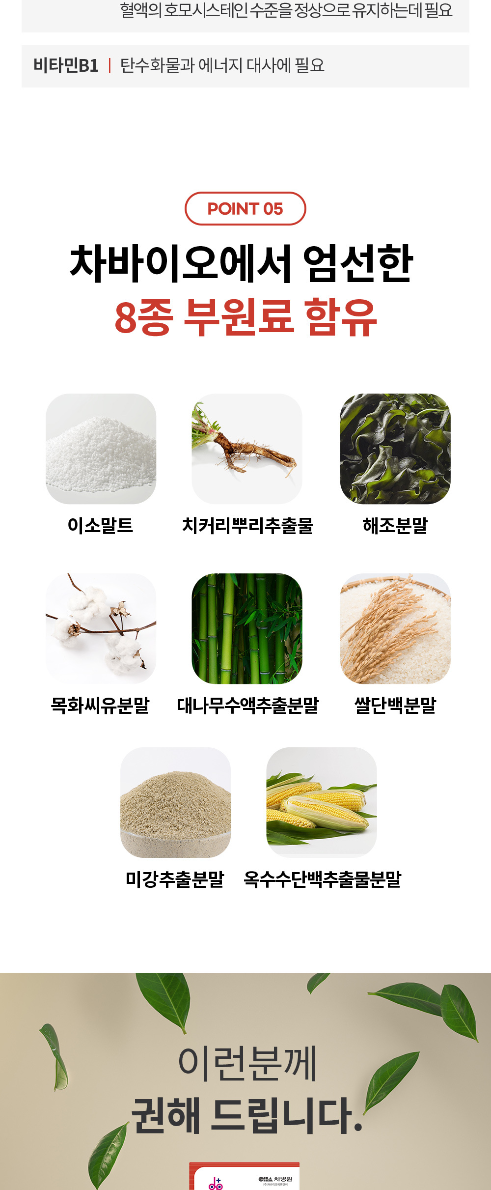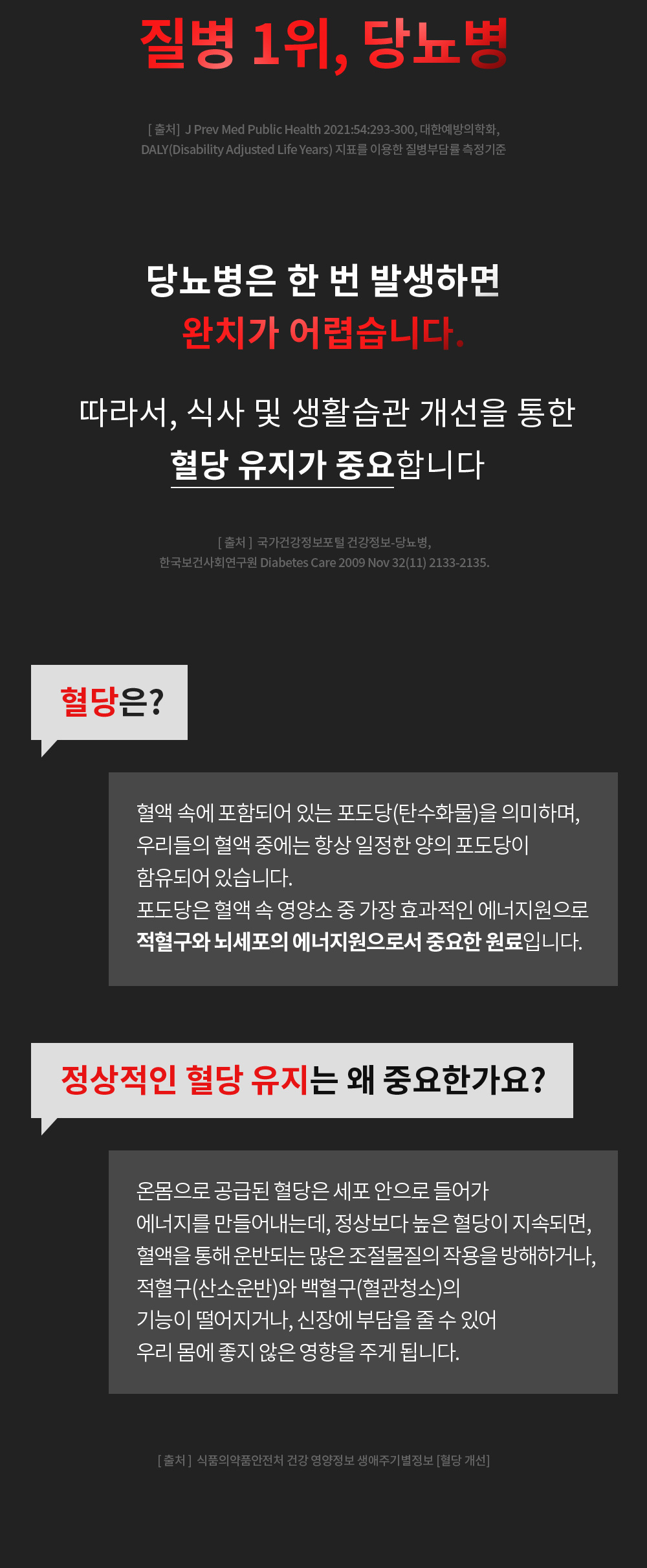 당뇨병이 있는 경우 섭취 전 전문가와 상담하십시오. 이상사례 발생 시 섭취를 중단하고 전문가와 상담하십시오. 본 제품은 알류(가금류),우유,메밀,땅콩,대두,밀,고등어,게,새우,돼지고기,복숭아,토마토,아황산류,호두,닭고기,쇠고기,오징어,잣,조개류(굴,전복,홍합 포함)를 원료로 한 제품과 같은 제조시설에서 제조되었습니다. 원료의 특성상 정제표면에 점박이가 보일 수 있으나 제품의 품질에는 이상이 없으니 안심하고 섭취하시기 바랍니다.